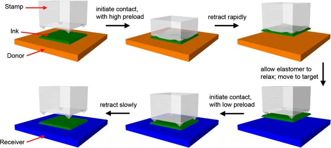 轉(zhuǎn)移打印是一種先進的確定性組裝技術(shù),通過實現(xiàn)材料/結(jié)構(gòu)/設備與精確定義的體系結(jié)構(gòu)的異構(gòu)集成,提供了實現(xiàn)與傳統(tǒng)晶圓器件性能相同的柔性電子器件的機會?;谶\動控制粘彈性印章的傳統(tǒng)轉(zhuǎn)印技術(shù)提供了最通用和方便的解決方案。然而,基于彈性體的速率依賴性附著力可調(diào)性的這些技術(shù)的過程可控性相當有限。許多主要受仿生學啟發(fā)的先進轉(zhuǎn)印技術(shù)已經(jīng)被開發(fā)出來,以顯著提高粘附性的可調(diào)性,例如使用角度微重疊印章的壁虎啟發(fā)轉(zhuǎn)印、使用充氣印章的蚜蟲啟發(fā)轉(zhuǎn)印、或使用表面浮雕結(jié)構(gòu)。然而,這些轉(zhuǎn)移打印技術(shù)的可切換性仍然不足以實現(xiàn)非接觸釋放(打?。┻^程。