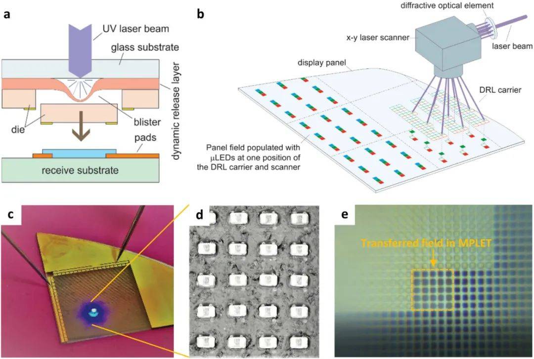 圖16b是選擇性地將μ-LED傳輸至面板的MPLET概念示意圖。圖16c、d顯示了一個單光束激光傳輸過程的成功演示,該過程將55×32×6μmμ-LED放置在帶有焊接焊盤的接收基板上。圖16e是從42μm×42μm×6μm假人模具的5×5陣列并行傳輸?shù)母咚僖曨l中提取的幀圖像。通過增加小束數(shù)和改善光斑質(zhì)量,可以進一步提高MPET的性能,而光斑質(zhì)量僅受激光器和相關(guān)光學元件的輸出功率的限制。這種激光輔助模具轉(zhuǎn)移技術(shù)可能成為一種真正具有顛覆性的技術(shù),適用于需要高精度放置大量具有極高組裝率的微器件的應用。