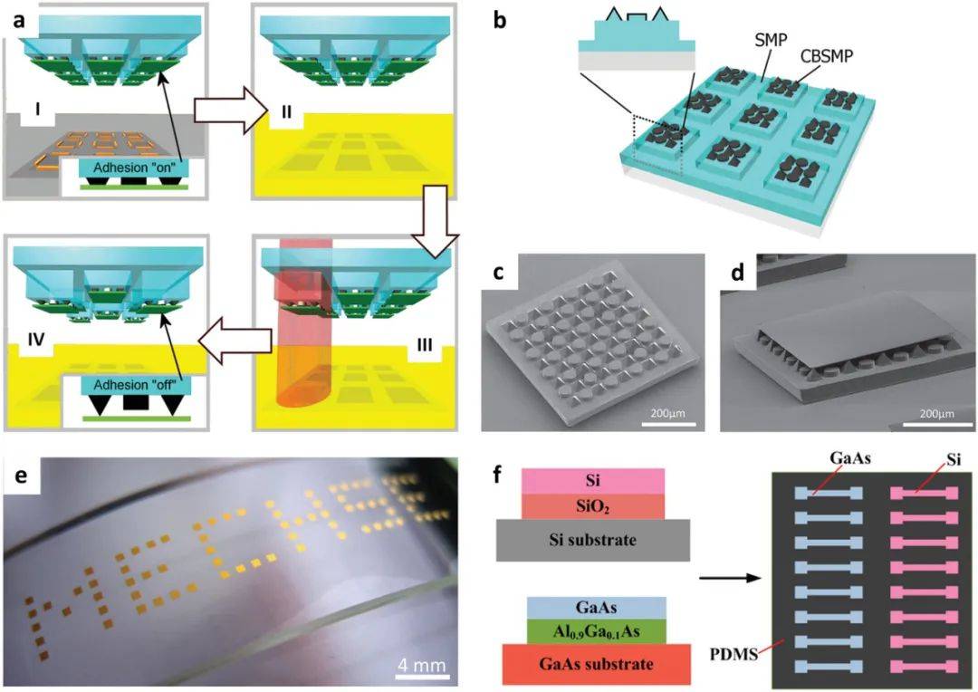 圖18 a)激光驅(qū)動的CBSMP打印過程的操作。b) CBSMP復合印章示意圖。c) CBSMP印章的掃描電鏡圖像。d) 3μm厚的硅油墨附著在印章上的SEM圖像。e)使用5×5陣列的CBSMP圖章,使用多個并行打印步驟將鍍金硅油墨打印到PDMS基板上的“MECHSE”圖案中。f)硅和砷化鎵的界面和生長襯底的比較,以及預期的混合打印布局。