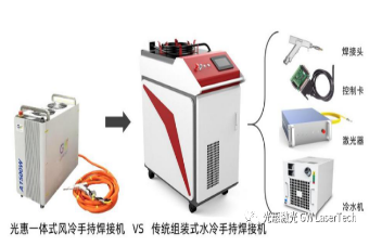 傳統(tǒng)的組裝式水冷手持焊接機(jī)主要包含焊接頭、控制卡、激光器、冷水機(jī),這四個(gè)部件都是獨(dú)立且完整的設(shè)備,通過(guò)線路和管路連接到一起,再裝到一個(gè)機(jī)柜中去。