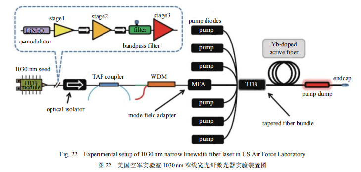 2016 年,美國空軍實驗室的 Nader A. Naderi 等使用 PRBS 信號調制 1030 nm 的單頻激光器作為種子源,種子源光譜線寬為 3.5 GHz,之后經(jīng)放大級進行放大,實驗裝置如圖 22 所示。該系統(tǒng)將 1030 nm 波段的激光輸出功率提升至 1034 W,光譜線寬為 11 pm,放大級輸出效率為 80%,ASE 抑制比達 40 dB,光束質量為 M2=1.1~1.2。實驗中通過控制增益光纖長度來抑制 SBS 和 ASE 效應[47-48]。