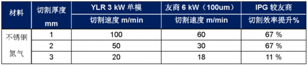 圖表2. YLR 3kW單模激光器和友商6kW(100μm)激光器不銹鋼氮?dú)馇懈钏俣葘?duì)比