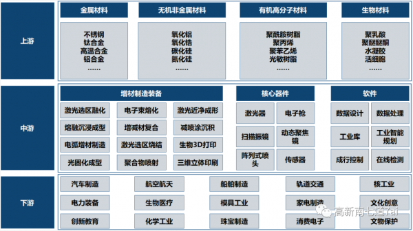 激光和增材制造產(chǎn)業(yè)主要包括中上游基礎(chǔ)材料、專(zhuān)用材料、核心器件、支撐軟件、激光器,及下游裝備系統(tǒng)和應(yīng)用服務(wù)等。