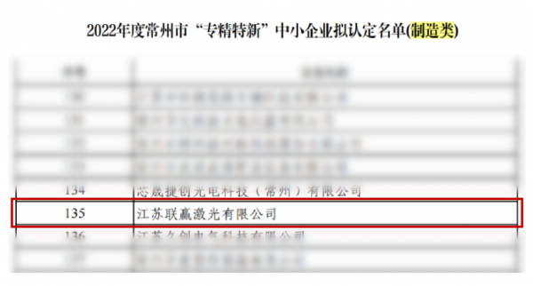 聯(lián)贏激光全資子公司江蘇聯(lián)贏獲常州市“專精特新”企業(yè)認(rèn)定