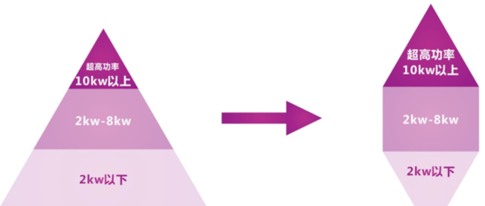 如今,激光加工功率已經(jīng)形成了金字塔式的分層,在金字塔頂端,超高功率部分10KW以上占少數(shù),其功率水平也將越來(lái)越高。而中高功率部分3KW至10KW是目前發(fā)展最快的領(lǐng)域。底部應(yīng)用屬于2KW以下的切割市場(chǎng)?;貧w到實(shí)際應(yīng)用,超高功率批量并不大,在真正的應(yīng)用層面,2000-8000瓦的用量正在快速回歸。