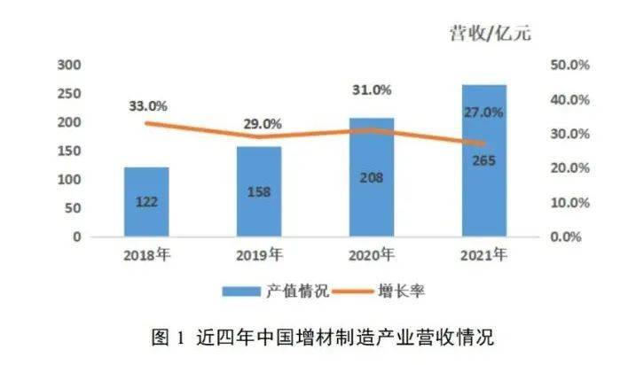 近年來(lái),隨著增材制造技術(shù)的不斷成熟,產(chǎn)業(yè)總收入持續(xù)增加,優(yōu)勢(shì)企業(yè)發(fā)展壯大。據(jù)中國(guó)增材制造產(chǎn)業(yè)聯(lián)盟估算,2021年增材制造企業(yè)營(yíng)收約為265億元,近四年平均增長(zhǎng)率30%,較全球年均復(fù)合增長(zhǎng)率20.4%高出10個(gè)百分點(diǎn)。