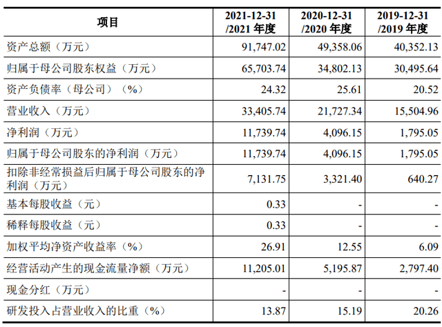 財務(wù)數(shù)據(jù)顯示,公司2019年、2020年、2021年營收分別為1.55億元、2.17億元、3.34億元;同期對應(yīng)的歸母凈利潤分別為1795.05萬元、4096.15萬元、1.17億元。