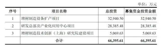 本次募集資金用于項目及擬投入的募資金額為:增材制造設(shè)備擴產(chǎn)項目,募集資金投資金額約3.29億元;研發(fā)總部及產(chǎn)業(yè)化應(yīng)用中心項目,募集資金投資金額約2.84億元;增材制造技術(shù)創(chuàng)新(上海)研究院建設(shè)項目,募集資金投資金額5069.63萬元。