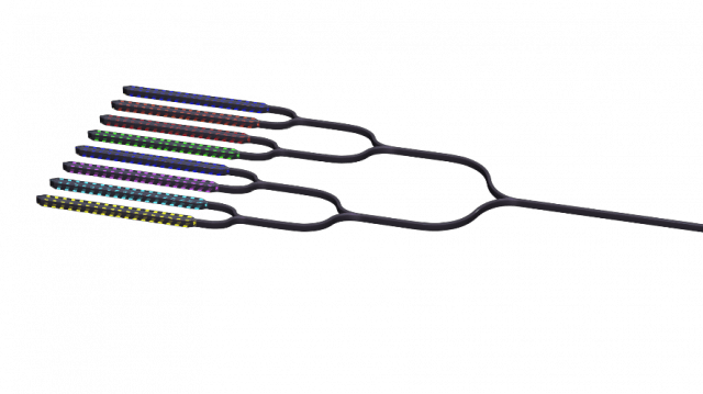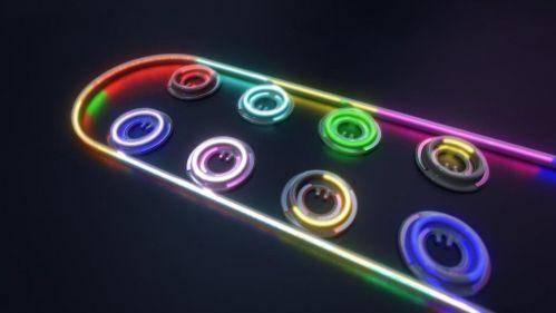 8個微環(huán)調(diào)制器和光波導(dǎo)。每個微環(huán)調(diào)制器都被調(diào)節(jié)到特定的波長(或者說“光色”)。利用多波長,每個微環(huán)都可單獨調(diào)制光波,以實現(xiàn)獨立通信。這種使用多個波長的方法就叫做波分復(fù)用。(圖片來源:英特爾公司)