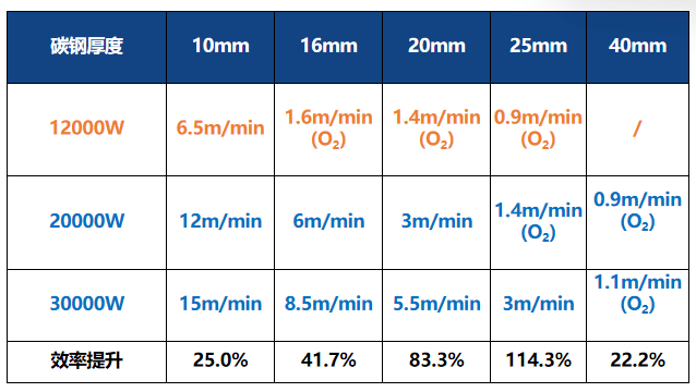 多模組30 kW、多模組20 kW及多模組12 kW切割碳鋼進(jìn)行工藝實測(表格中未標(biāo)注輔助氣體的為空氣)
