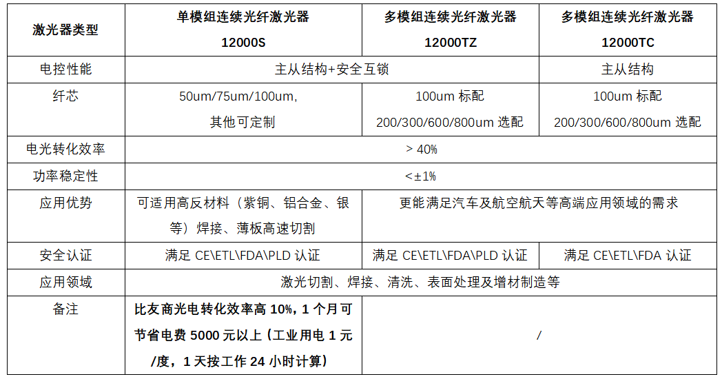 此外,為了滿足不同公司個性化應(yīng)用需求,同種功率下銳科激光可提供更多選擇。以12 kW為例,銳科激光生產(chǎn)制造單模組連續(xù)光纖激光器12000S、多模組連續(xù)光纖激光器12000TZ、12000TC等多種同功率的光纖激光器,而且同一類型的激光器還可定制匹配不同的纖芯,可最大程度地滿足客戶的需求。