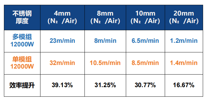 單模組萬瓦激光器的優(yōu)勢在中薄板切割速度,以銳科單模組12000和多模組12000激光器進(jìn)行對比,在20 mm以下不同厚度的不銹鋼輔助氮氣或空氣切割條件下,單模組12000切割效率優(yōu)于多模組12000光纖激光器。