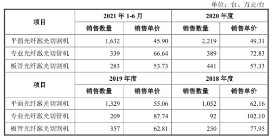 公司主要產(chǎn)品平均售價(jià)均呈下降趨勢(shì)。2018年至2021年1-6月,宏石激光平面光纖激光切割機(jī)平均銷售單價(jià)分別為62.16萬(wàn)元、55.06萬(wàn)元、49.31萬(wàn)元、45.90萬(wàn)元;專業(yè)光纖激光切管機(jī)平均銷售單價(jià)分別為102.10萬(wàn)元、87.74萬(wàn)元、72.83萬(wàn)元、66.64萬(wàn)元;板管光纖激光切割機(jī)平均銷售單價(jià)分別為77.95萬(wàn)元、62.81萬(wàn)元、57.33萬(wàn)元、53.73萬(wàn)元。