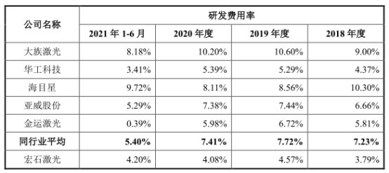 2018年至2021年1-6月,宏石激光研發(fā)費(fèi)用分別為3,779.26萬(wàn)元、5,549.49萬(wàn)元、7,295.86萬(wàn)元和5,119.21萬(wàn)元,占營(yíng)業(yè)收入的比例分別為3.79%、4.57%、4.08%和4.20%。