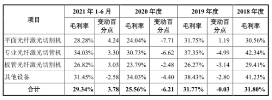 2018年至2021年1-6月,宏石激光綜合毛利率分別為31.76%、31.27%、24.68%和29.76%,公司主營(yíng)業(yè)務(wù)毛利率分別為31.80%、31.77%、25.56%和29.34%。