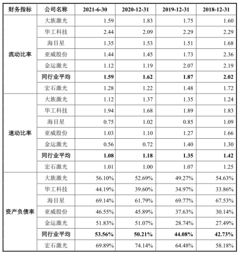 2018年至2021年1-6月,宏石激光負(fù)債總額分別為26,485.11萬(wàn)元、47,729.46萬(wàn)元、92,431.21萬(wàn)元、115,278.75萬(wàn)元,資產(chǎn)負(fù)債率(合并)分別為58.18%、64.48%、74.14%、69.89%。