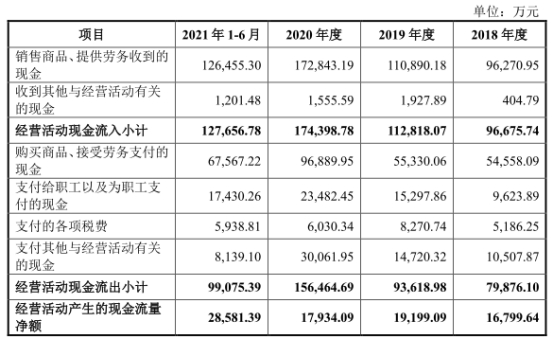報(bào)告期內(nèi),公司經(jīng)營(yíng)活動(dòng)產(chǎn)生的現(xiàn)金流量?jī)纛~分別為16,799.64萬(wàn)元、19,199.09萬(wàn)元、17,934.09萬(wàn)元、28,581.39萬(wàn)元,銷售商品、提供勞務(wù)收到的現(xiàn)金分別為96,270.95萬(wàn)元、110,890.18萬(wàn)元、172,843.19萬(wàn)元、126,455.30萬(wàn)元。