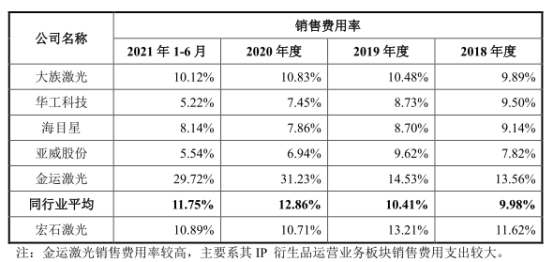 2018年至2021年1-6月,宏石激光銷售費(fèi)用分別為11,591.83萬(wàn)元、16,046.14萬(wàn)元、19,132.02萬(wàn)元和13,279.76萬(wàn)元,占營(yíng)業(yè)收入的比例分別為11.62%、13.21%、10.71%和10.89%。報(bào)告期內(nèi),同行業(yè)可比公司銷售費(fèi)用率均值分別為9.98%、10.41%、12.86%、11.75%。