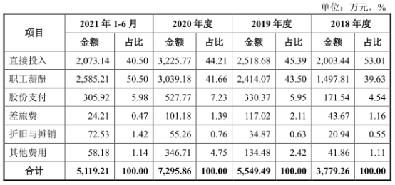 報(bào)告期各期,銷售費(fèi)用中職工薪酬分別為3,535.33萬(wàn)元、6,149.79萬(wàn)元、10,346.40萬(wàn)元、7,277.32萬(wàn)元,在研發(fā)費(fèi)用中的比例分別為30.50%、38.33%、54.08%、54.80%。