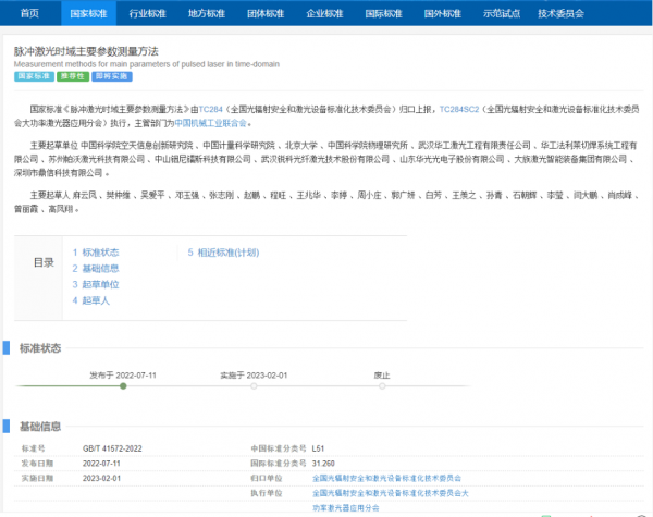 由TC284(全國光輻射安全和激光設備標準化技術委員會)歸口上報,TC284SC2(全國光輻射安全和激光設備標準化技術委員會大功率激光器應用分會)執(zhí)行,中國機械工業(yè)聯(lián)合會主管的國家標準GB/T41572-2022《脈沖激光時域主要參數(shù)測量方法》于2022年7月11日正式發(fā)布,并將于2023年2月1日實施。