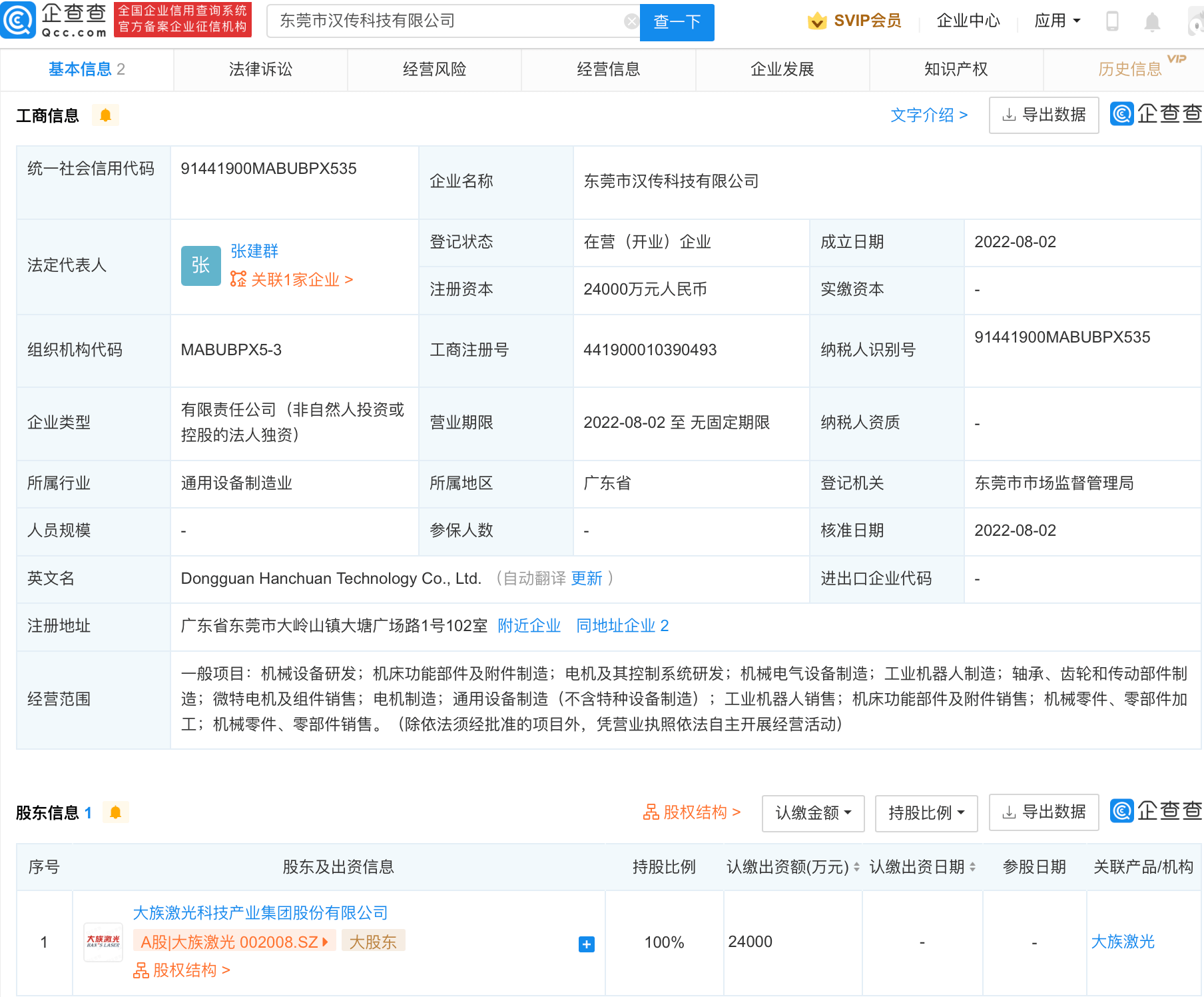 8月2日,東莞市漢傳科技有限公司成立,法定代表人為張建群,注冊(cè)資本2.4億人民幣,經(jīng)營(yíng)范圍包括機(jī)械設(shè)備研發(fā);機(jī)床功能部件及附件制造;電機(jī)及其控制系統(tǒng)研發(fā);機(jī)械電氣設(shè)備制造;工業(yè)機(jī)器人制造等。股東信息顯示,該公司由大族激光科技產(chǎn)業(yè)集團(tuán)股份有限公司全資控股。