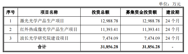 本次擬投資項目的投資總額為3.19億元,擬投入募資3.19億元,主要募投項目分別是激光光學產(chǎn)品生產(chǎn)項目、紅外熱成像光學產(chǎn)品生產(chǎn)項目以及波長光學研究院建設(shè)項目。