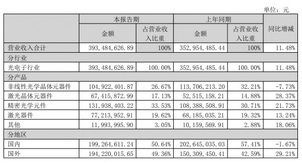 從下圖的營(yíng)業(yè)收入構(gòu)成也可以看出,報(bào)告期內(nèi),福晶科技的主要收入來(lái)源為銷(xiāo)售精密學(xué)光元件(占比33.53%)、非線(xiàn)性光學(xué)晶體元器件(占比26.67%)、激光器件(占比19.62%)、激光晶體元器件(占比17.13%)等。除非線(xiàn)性光學(xué)晶體元器件的營(yíng)收與去年同期下降7.73%外,均實(shí)現(xiàn)了幅度較大的增長(zhǎng)。