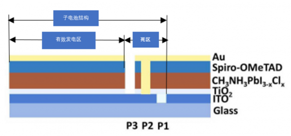 對(duì)于鈣鈦礦薄膜太陽(yáng)能模組來(lái)說(shuō),死區(qū)是一個(gè)非常關(guān)鍵的技術(shù)指標(biāo)。眾所周知,薄膜太陽(yáng)能模組是由一百多個(gè)子電池串聯(lián)起來(lái)組成的,每個(gè)子電池包含兩個(gè)區(qū)域:不能發(fā)電的死區(qū)與可以發(fā)電的有效區(qū),死區(qū)越小,有效發(fā)電面積就越大,模組的輸出功率就越大。
