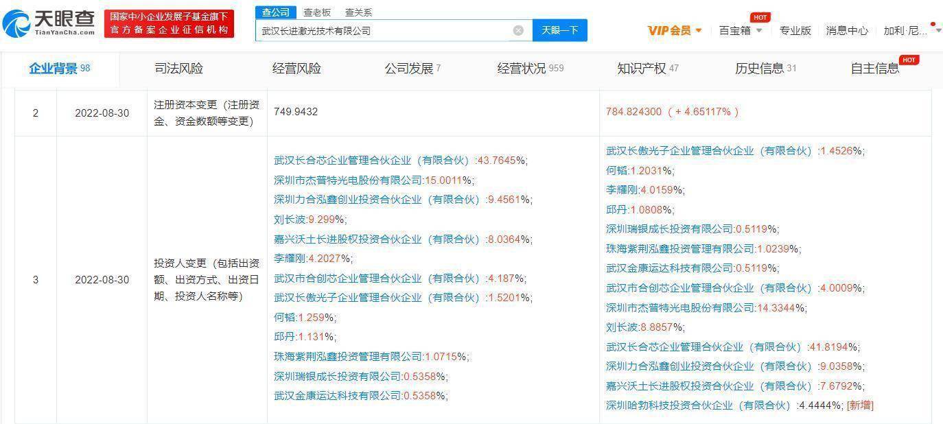 近日,武漢長(zhǎng)進(jìn)激光技術(shù)有限公司發(fā)生工商變更,新增深圳哈勃科技投資合伙企業(yè)(有限合伙)為股東,持股約4.44%。同時(shí),公司注冊(cè)資本由749.94萬(wàn)人民幣增至784.82萬(wàn)人民幣。
