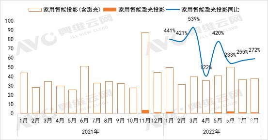 近期,奧維云網發(fā)布消息稱:2022 年 1-8 月,家用激光投影銷量達 11.1 萬臺,同比增長 301%;銷額 6.7 億元,同比增長 239%。
