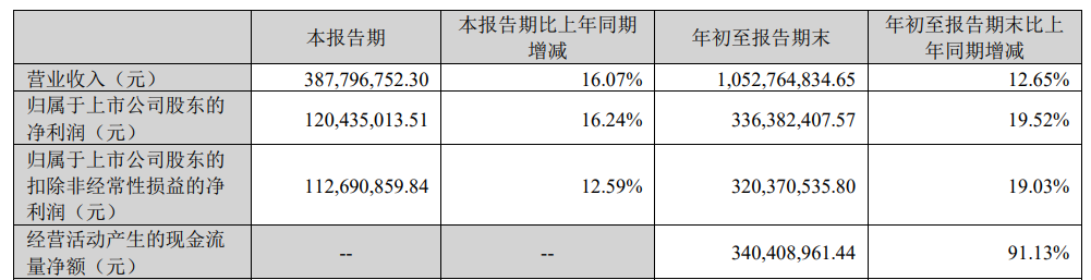 今年前三季度,帝爾激光實(shí)現(xiàn)營業(yè)收入10.53億元,同比增長12.65%;歸屬于上市公司股東凈利潤3.36億元,同比增長19.52%;歸屬于上市公司股東的扣除非經(jīng)常性損益的凈利潤3.20億元,同比增長19.03%;經(jīng)營活動(dòng)產(chǎn)生的現(xiàn)金流量凈額3.40億元,同比增長91.13%。