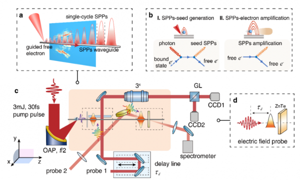 中國科學(xué)院上海光學(xué)精密機(jī)械研究所強(qiáng)場激光物理國家重點(diǎn)實(shí)驗(yàn)室李儒新院士和田野研究員團(tuán)隊(duì)在小型化自由電子相干光源研究領(lǐng)域取得突破性進(jìn)展。研究團(tuán)隊(duì)實(shí)驗(yàn)探索飛秒激光驅(qū)動(dòng)的超短電子脈沖泵浦表面等離極化激元(surface plasmon polariton,SPP)的動(dòng)力學(xué)過程,通過對(duì)自由電子脈沖泵浦SPP相干放大的動(dòng)態(tài)過程觀測,闡述了自由電子與SPP作用過程中的受激放大機(jī)理。該項(xiàng)研究采用超快光學(xué)技術(shù)探測了自由電子受激輻射放大的全過程,研究成果指明了采用自由電子泵浦SPP實(shí)現(xiàn)其相干放大的全新途徑,對(duì)于發(fā)展小型化/集成化的相干光源具有重要意義。相關(guān)研究成果于2022年11月3日發(fā)表于《自然》(Nature)雜志。