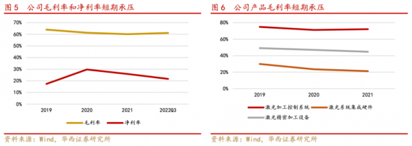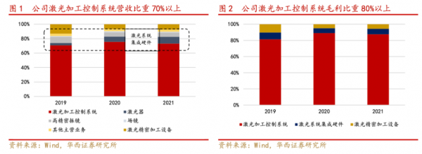激光加工控制系統(tǒng)營收占比較高,貢獻主要業(yè)績。從營收角度來看,2019-2021年,公司激光加工控制系統(tǒng)占公司總營收的比例分別為70.22%、76.14%和72.97%;激光系統(tǒng)集成硬件分別為16.94%、17.33%和19.68%;激光精密加工設備分別為12.84%、6.53%和7.36%。從毛利角度來看,2019-2021年公司激光加工控制系統(tǒng)毛利占比維持在80%以上,是公司主要的利潤來源。