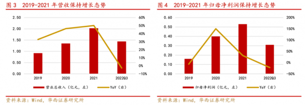 2019-2021年公司業(yè)績保持高增長,22年前三季度業(yè)績承壓。2019-2021年,公司營收從0.92億元提升至2.02億元,復合增速約48%;歸母凈利潤從1605.55萬元提升至5262.53萬元,復合增速約80%。2022年前三季度,受疫情影響,公司營收和歸母凈利潤分別同比下降2.74%和21.98%,為1.44億元和0.31億元,業(yè)績暫時承壓。