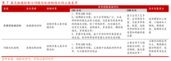 激光加工控制系統(tǒng)按照主流技術路線可劃分為激光振鏡控制系統(tǒng)及伺服控制系統(tǒng)等。兩種方式均以CAD/CAM軟件為核心,并配套嵌入系統(tǒng)核心算法的硬件板卡,核心均為對激光軌跡控制、電路控制、運動軸等邏輯控制。振鏡控制主要通過振鏡擺動來控制激光的出光路徑及加工速度,而伺服電機控制主要通過激光頭的運動來控制激光的作業(yè)輸出。