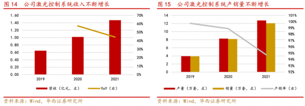 高精密振鏡控制系統(tǒng)深耕多年,營收不斷增長。2019-2021年公司激光加工控制系統(tǒng)的營業(yè)收入分別為0.65億元、1.02億元和1.47億元,呈現(xiàn)快速增長態(tài)勢;激光加工控制系統(tǒng)銷量較上期同比增長52.94%、109.32%、47.89%,產品銷量大幅增長。同時,公司通過價格調整、開發(fā)新產品等方式擴大銷量。