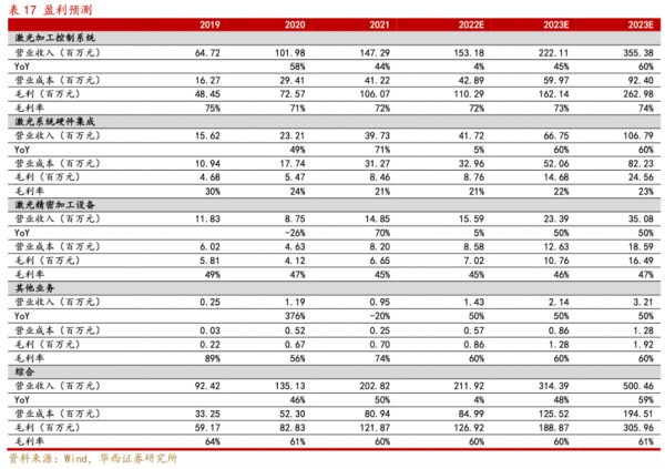 2022年激光行業(yè)整體承壓,或對公司收入端造成一定影響。2022-2023年通用行業(yè)復蘇預期強烈,疊加公司不斷拓展新的產品與行業(yè),各個業(yè)務板塊有望恢復高增,毛利率水平也有望維持較好的水平且略有提升。