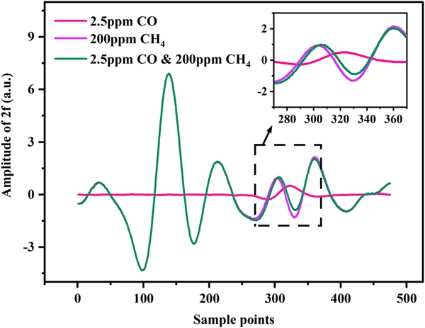 CO和CH4分別測(cè)量和混合氣測(cè)量的二次諧波信號(hào)情況