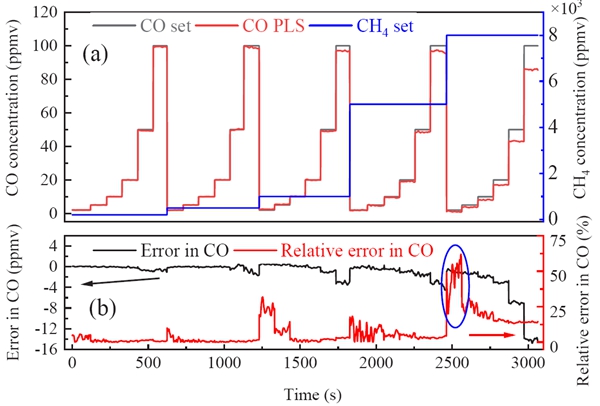 該團(tuán)隊(duì)研究人員對(duì)煤礦中甲烷(CH4)和微量一氧化碳(CO)氣體進(jìn)行分析,分別利用偏最小二乘和非負(fù)最小二乘方法,解決了含量為百分量級(jí)的CH4和百萬分量級(jí)的CO氣體的混疊光譜干擾的解調(diào)問題。從吸收光譜機(jī)理上提出了“光譜分離度”的概念,并進(jìn)行了詳實(shí)的仿真模擬和復(fù)雜的實(shí)驗(yàn)驗(yàn)證。經(jīng)過實(shí)驗(yàn)分析,兩種方法均表現(xiàn)出了良好的解調(diào)效果,能夠在兩種氣體濃度相差3-4個(gè)數(shù)量級(jí)(光譜特征嚴(yán)重混疊干擾)的特殊情況下仍然準(zhǔn)確解調(diào)其中的微量氣體成分,提高了系統(tǒng)的選擇性和可靠性。因此,該方法能夠在不增加壓力控制等硬件設(shè)備的基礎(chǔ)之上,利用軟件算法解調(diào)混疊光譜,為利用單支DFB激光器完成兩種或多種混合氣體濃度的準(zhǔn)確測(cè)量提供了方向,拓寬了激光吸收光譜氣體傳感系統(tǒng)的環(huán)境適用性和應(yīng)用前景。