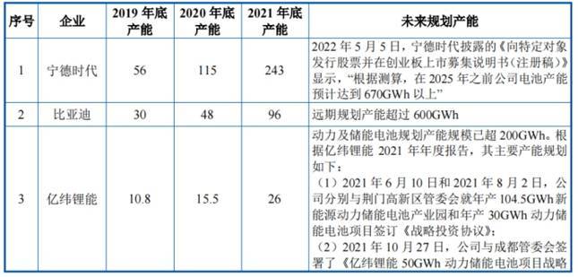 同時,得益于新能源汽車、儲能及消費(fèi)電子市場的快速發(fā)展,相關(guān)鋰電池生產(chǎn)企業(yè)紛紛制定和實施擴(kuò)產(chǎn)計劃,比如寧德時代、國軒高科、億緯鋰能等,國內(nèi)主要動力電池企業(yè)產(chǎn)能規(guī)劃情況(GWh)如下: