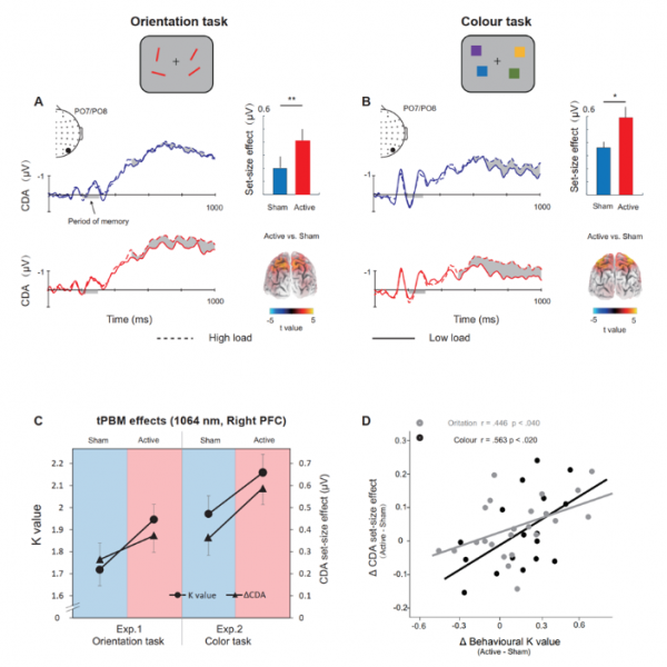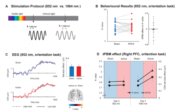 如圖2所示,研究者發(fā)現(xiàn)1064 nm 光刺激作用于右側(cè)前額葉可以顯著提高個(gè)體的視覺工作記憶容量,并擴(kuò)大工作記憶容量相關(guān)的事件相關(guān)電位(Event-Related potentials, ERP)成分——對(duì)側(cè)延遲活動(dòng)(Contralateral Delay Activity, CDA)。重要的是,CDA的負(fù)載效應(yīng)是光生物調(diào)節(jié)和工作記憶行為增強(qiáng)的中介。