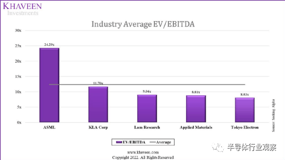 這家光刻機(jī)龍頭似乎總有一股魔力,哪怕在10月份,整體半導(dǎo)體設(shè)備廠商的股價(jià)都步入低谷之際,ASML依舊讓投資機(jī)構(gòu)給出了超凡的估值。Khaveen Investments在10月11日的報(bào)告中,給出了ASML 24.29x的企業(yè)估值數(shù)據(jù),而他們認(rèn)為半導(dǎo)體設(shè)備行業(yè)平均EV / EBITDA (EV/EBITDA 又稱(chēng)企業(yè)價(jià)值倍數(shù),是一種被廣泛使用的公司估值指標(biāo))僅為12.37 x,是 ASML的一半,其余KLA、Lam Research、應(yīng)用材料、Tokyo Electron (TEL)等幾家設(shè)備巨頭的估值甚至皆未達(dá)到均值。