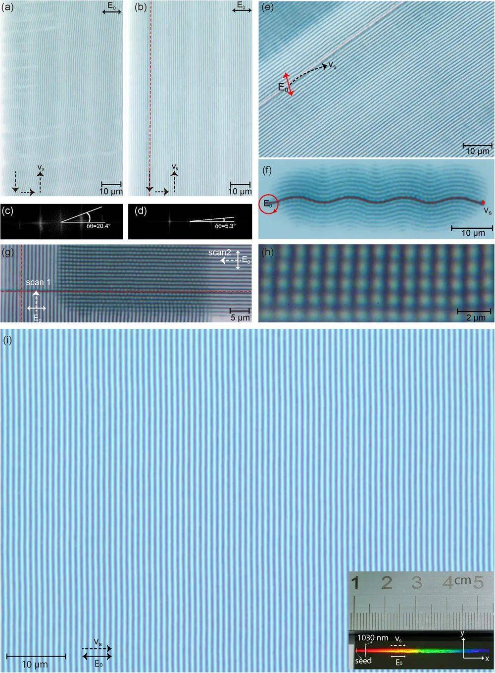 圖4:納米光柵的顯微圖像和相應(yīng)的2D-FFT,該納米光柵是a,c)不使用和b,d)使用人工種子制造的。分別用e)線極化和f)圓極化控制彎曲種子形成納米光柵。g,h)二維納米結(jié)構(gòu)由激光光束的正交偏振和掃描方向的兩次掃描產(chǎn)生。(b,f,g)中的紅色虛線表示最初種子的位置,引導(dǎo)眼睛。i)大規(guī)模激光加工區(qū)域內(nèi)具有代表性的納米光柵(插圖),由x軸寬度為30 μ m, y軸長(zhǎng)度為3mm的線狀光束光斑獲得。虛線箭頭和實(shí)線箭頭分別表示掃描軌跡和激光偏振。所有實(shí)驗(yàn)的激光通量和掃描速度均為F0 = 25 mJ cm?2 versus = 20 μm s?1