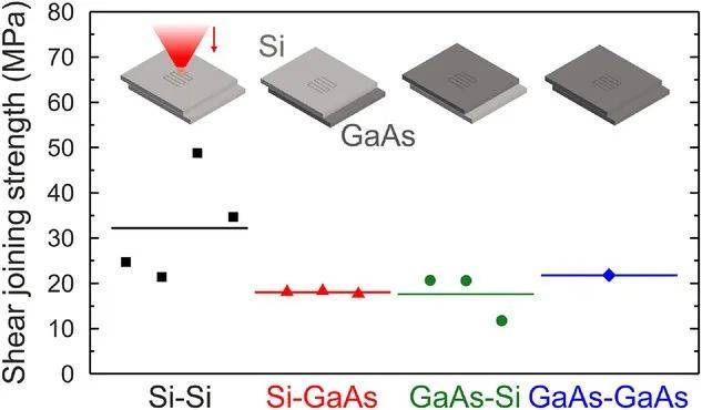 對比圖4中得到的剪切連接強(qiáng)度值,可以注意到這些值都在同一個(gè)數(shù)量級,其中Si-Si表現(xiàn)出最強(qiáng)的粘結(jié)。不同的材料焊接配置,無論是Si或GaAs在頂部,得到的值相似,都小于Si - Si得到的值。盡管對GaAs-GaAs焊接情況進(jìn)行了一次測量,但結(jié)果表明Si-Si樣品的性能水平(測量分布的底部),因此與類似半導(dǎo)體焊接所獲得的優(yōu)異性能一致。與此同時(shí),有趣的是,與GaAs-Si相比,Si-GaAs結(jié)構(gòu)中測量的統(tǒng)計(jì)色散有所減少。這表明GaAs對實(shí)驗(yàn)波動(dòng)具有更好的魯棒性,這也可以歸因于GaAs的修飾閾值明顯低于Si。考慮到這一點(diǎn),我們假設(shè)Si - GaAs結(jié)構(gòu)必須容忍更多的光學(xué)接觸缺陷,即使在兩個(gè)分離良好的表面(R = 30%)的預(yù)期界面透射率約為50%,在Si和GaAs低樣品中,材料熔化也很容易同時(shí)達(dá)到。