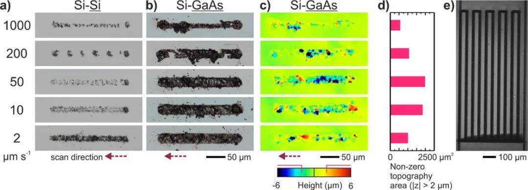 在圖3b中,展示了底部GaAs上產(chǎn)生的線的代表性圖像選擇。較低的修飾閾值使GaAs的相互作用更強(qiáng),從而產(chǎn)生更寬(≈30μm)和更明顯的線條。然而,與之前不同的是,對共焦圖像的分析(圖3c)揭示了最佳掃描速度,對應(yīng)于50 μm s-1,而不是最慢的掃描速度。為了說明這方面的詳細(xì)分析,我們在圖3d中為圖3c的每張圖像展示了地形中海拔或凹陷超過2 μm的區(qū)域(|z|>2 μm)。將這一任意判據(jù)作為材料混合概率的評價(jià)標(biāo)準(zhǔn),得出最佳掃描速度為50 μm s-1。與Si相比,這種增加的速度允許對幾個(gè)樣品進(jìn)行更快的光柵掃描輻照(如圖3e所示),從而在這種不同的半導(dǎo)體配置中測量到18±1 MPa的剪切連接強(qiáng)度。與Si-Si相比的差異可以合理地歸因于與表現(xiàn)出不同熱機(jī)械性能的材料焊接相關(guān)的通常挑戰(zhàn)。然而,它是適合的而且測量的強(qiáng)度有趣地顯示了這種技術(shù)的潛力,即使用貫穿Si傳輸配置將Si與其他半導(dǎo)體焊接。
