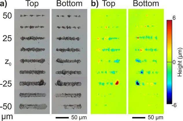 圖2:a)相對于參考位置Z0在不同焦距下界面周圍產(chǎn)生的線的頂部和底部晶片表面光學(xué)顯微鏡圖像。b)相應(yīng)的共聚焦顯微圖像顯示表面形貌。頂部和底部線的輪廓和地形都相互匹配,表明晶圓之間有材料轉(zhuǎn)移。注意圖1a中所示的頂部和底部圖像之間處理區(qū)域的鏡像對應(yīng)關(guān)系。