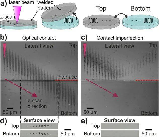 圖1:a)焊接結(jié)構(gòu)示意圖(z掃描和模式)和連續(xù)分離程序,以可視化激光照射時(shí)接觸的頂部和底部晶圓表面的變化。b,c)兩個(gè)Si晶片界面區(qū)域的紅外透射顯微鏡橫向視圖。紅色虛線表示接口的位置。在成像區(qū)中,從上到下不同深度(12.5 μm步長)(紫色虛線箭頭)產(chǎn)生1000個(gè)11 μJ脈沖的單點(diǎn)修改(25 μm橫向分離)。d,e)樣品分離后頂部和底部晶圓表面對應(yīng)的可見光顯微鏡圖像,如(a)所示。界面下經(jīng)過修飾的加工區(qū)域間接證明與底部晶圓具有良好的光學(xué)和高效耦合(b,d)。上樣內(nèi)部經(jīng)過修飾的加工區(qū)域,橫梁被界面反射,由于接觸不完美而沒有表面修飾(c,e)。