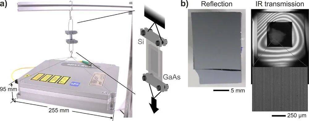 圖5:a)實(shí)驗(yàn)中使用的激光源圖像(≈3 kg)掛在焊接在GaAs上的Si晶片上。圖示如圖所示。b)從紅外透射圖像中,我們觀察到總處理面積為3.5 ×7.0 mm2,從中我們估計(jì)對剪切力的阻力高達(dá)400 n。紅外圖像上可見的干涉條紋歸因于材料界面處的法布里-珀羅腔,從而揭示了接觸不均勻性。