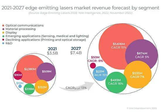 Yole預(yù)計(jì),邊緣發(fā)射激光器(EEL)市場(chǎng)將從2021的35億美元增長(zhǎng)到2027年的74億美元,在此期間(CAGR2021-2027)的復(fù)合年增長(zhǎng)率為13%。這種增長(zhǎng)將繼續(xù)受到光通信的驅(qū)動(dòng),如用于數(shù)據(jù)通信和電信的光模塊和放大器,以及3D傳感應(yīng)用。