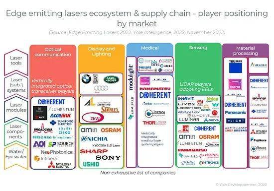 因此,EEL行業(yè)高度分散和多樣化。每個(gè)應(yīng)用都涉及特定的供應(yīng)鏈/價(jià)值鏈。制造商必須制定不同的定位以進(jìn)入不同的市場(chǎng)。大多數(shù)邊緣發(fā)射激光器制造商都是垂直集成的,即在內(nèi)部進(jìn)行外延、前端線尾(FEOL)處理、包括與激光二極管器件的圖樣相關(guān)的所有工藝步驟,以及后端線尾(BEOL)處理,包括互連和封裝。